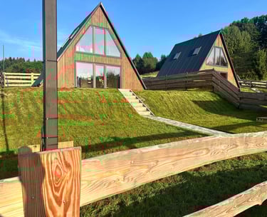 Kształt domków to trójkąt, co nadaje im unikalny charakter i harmonijnie wpisuje się w krajobraz.