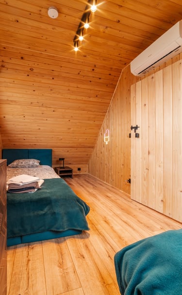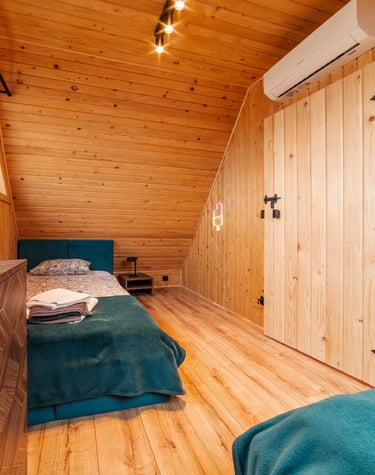 Każdy domek wyposażony jest w dwie sypialnie. W jednej sypialni znajduje się łóżko małżeńskie w drugiej dwa pojedyncze łóżka.