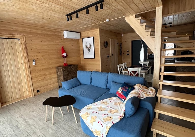 Nasze domki mają przestronny salon podzielony na strefę dzienną oraz aneks kuchenny z jadalnią.